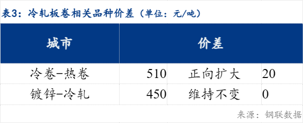 品种价差看,冷热价差510元/吨,镀冷价差450元/吨。