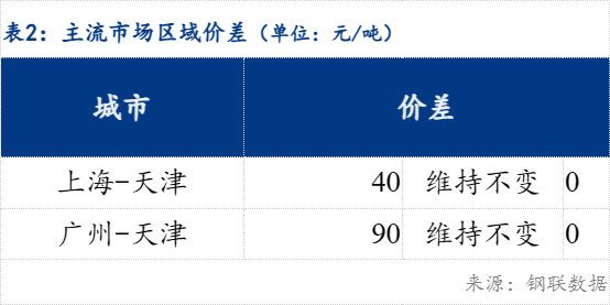 区域价差看,上海-天津价差40元/吨 ,广州-天津价差90元/吨 。